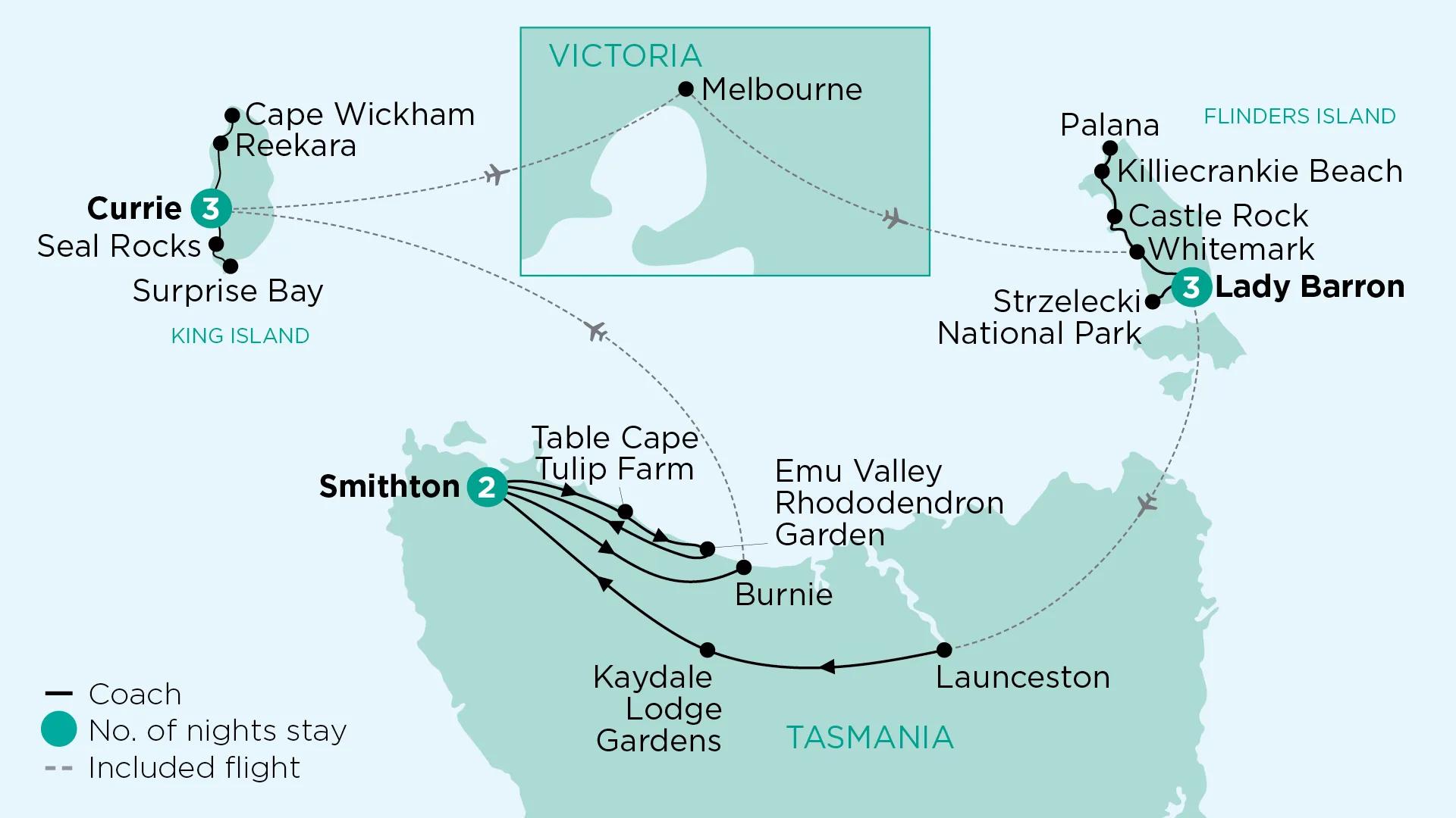 Includes eight nights’ accommodation in a comfortable hotel, return Melbourne flights to Flinders and King Island in economy class, return private airport-to-hotel transfers, plus 24 meals and select beverages
