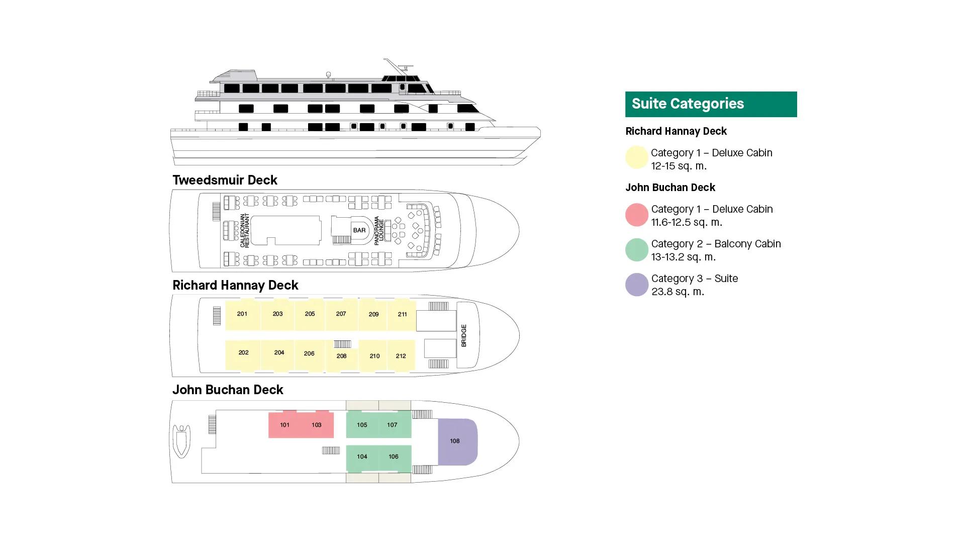 The four Category 2 Balcony Cabins are slightly larger, at 13 square metres (140 square feet). In addition to the amenities offered by Category 1 cabins, a small private balcony, along the John Buchan Deck, is also included.