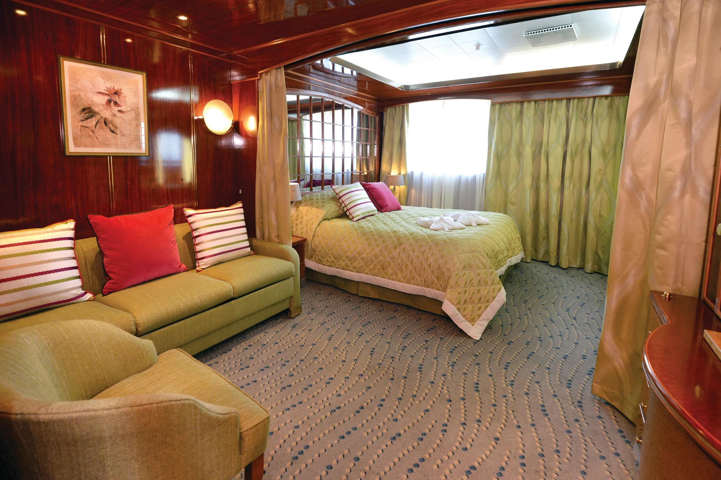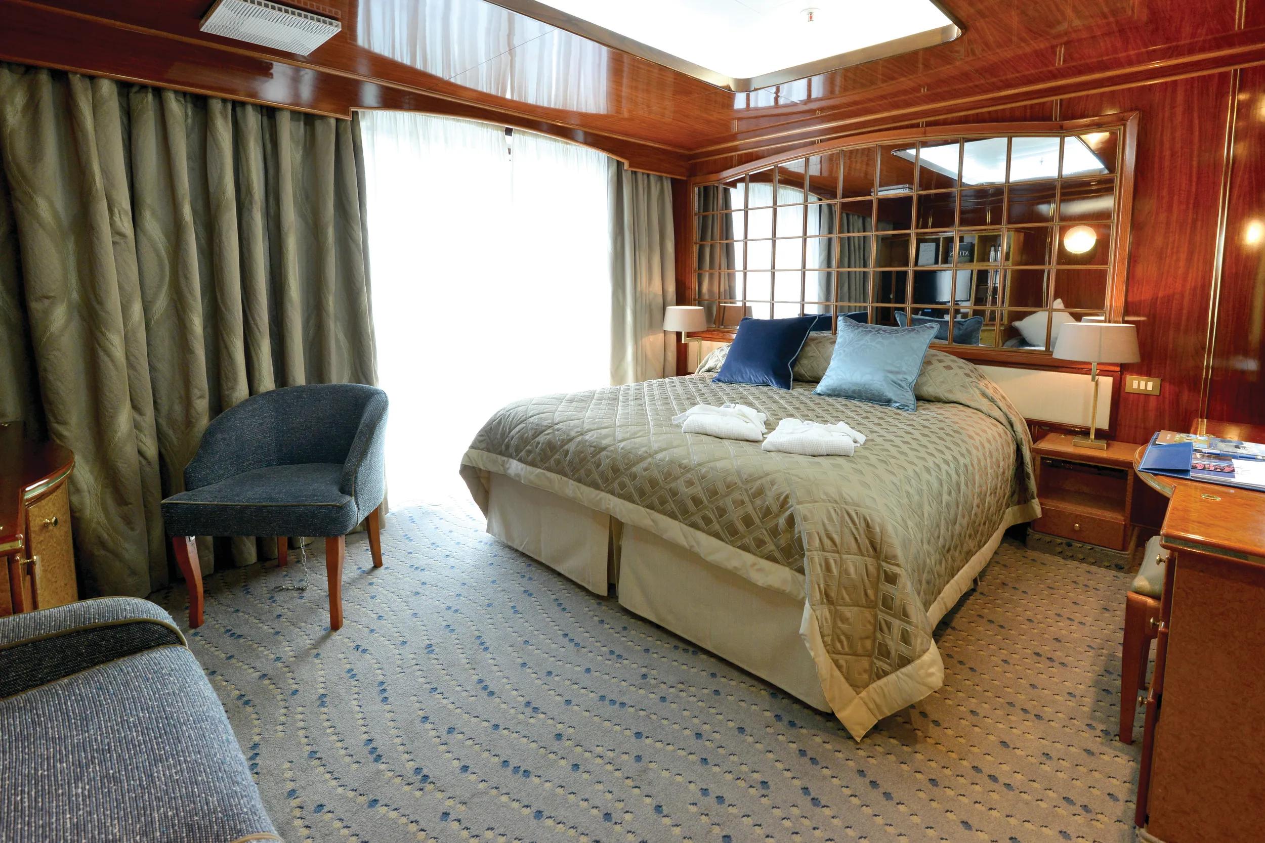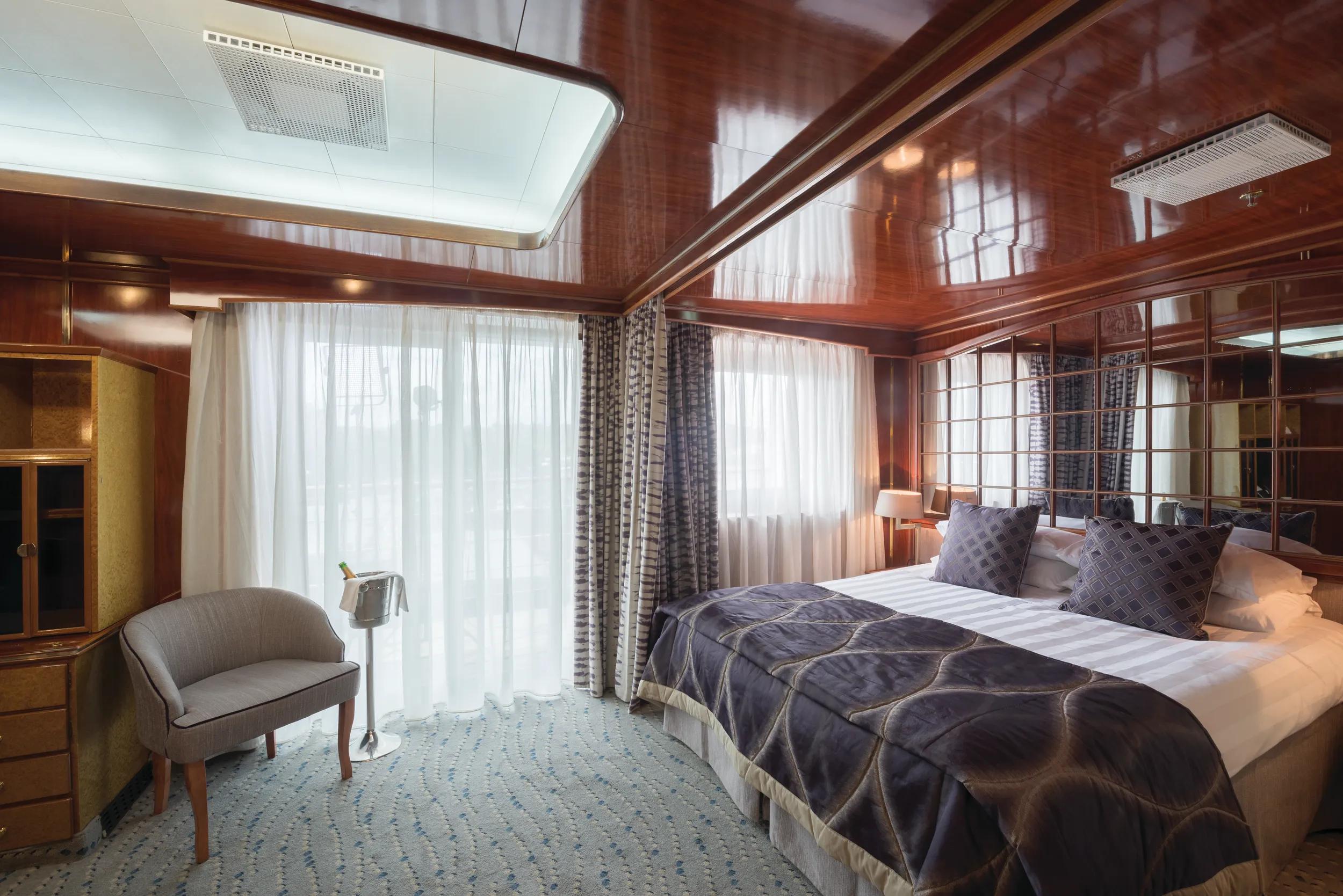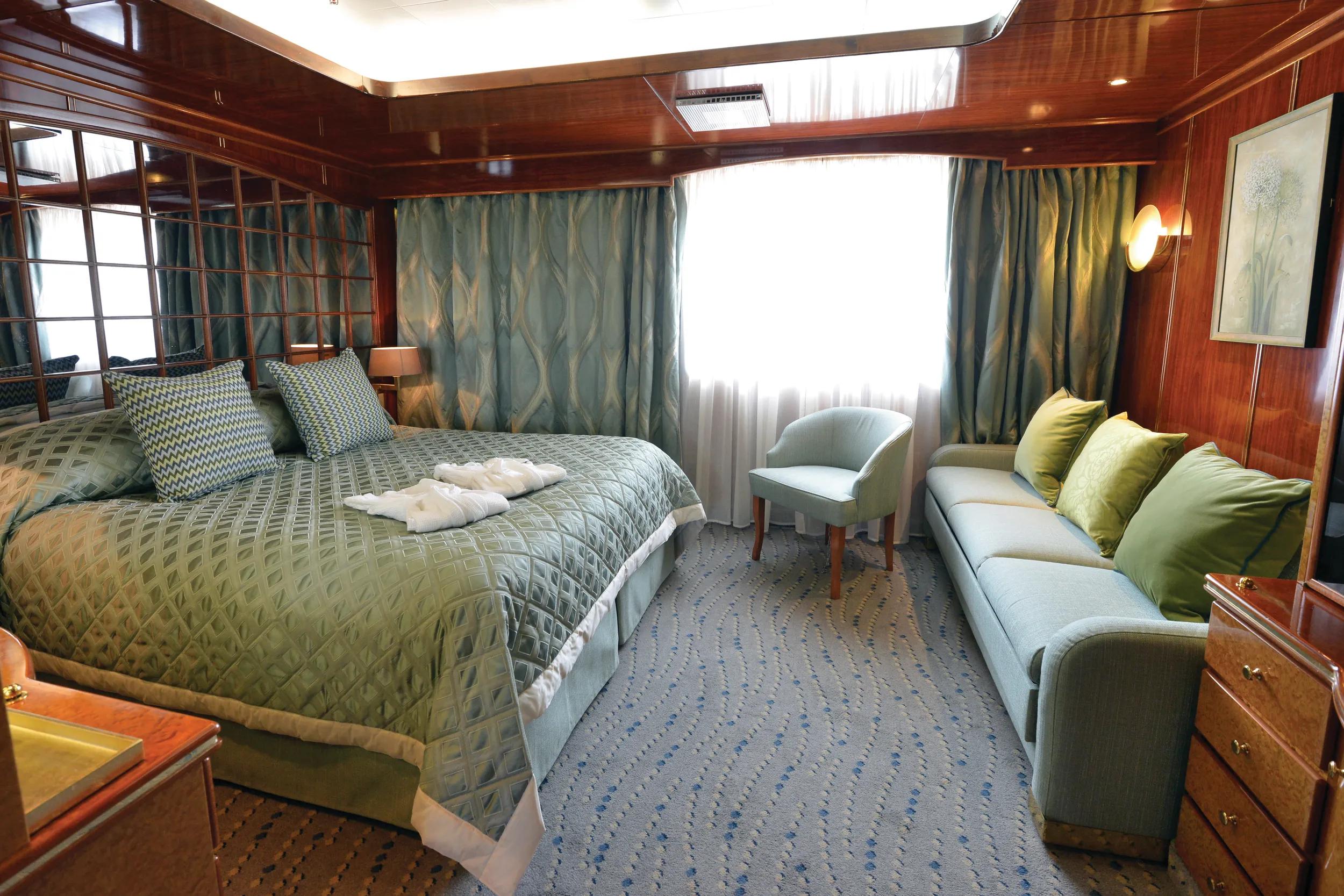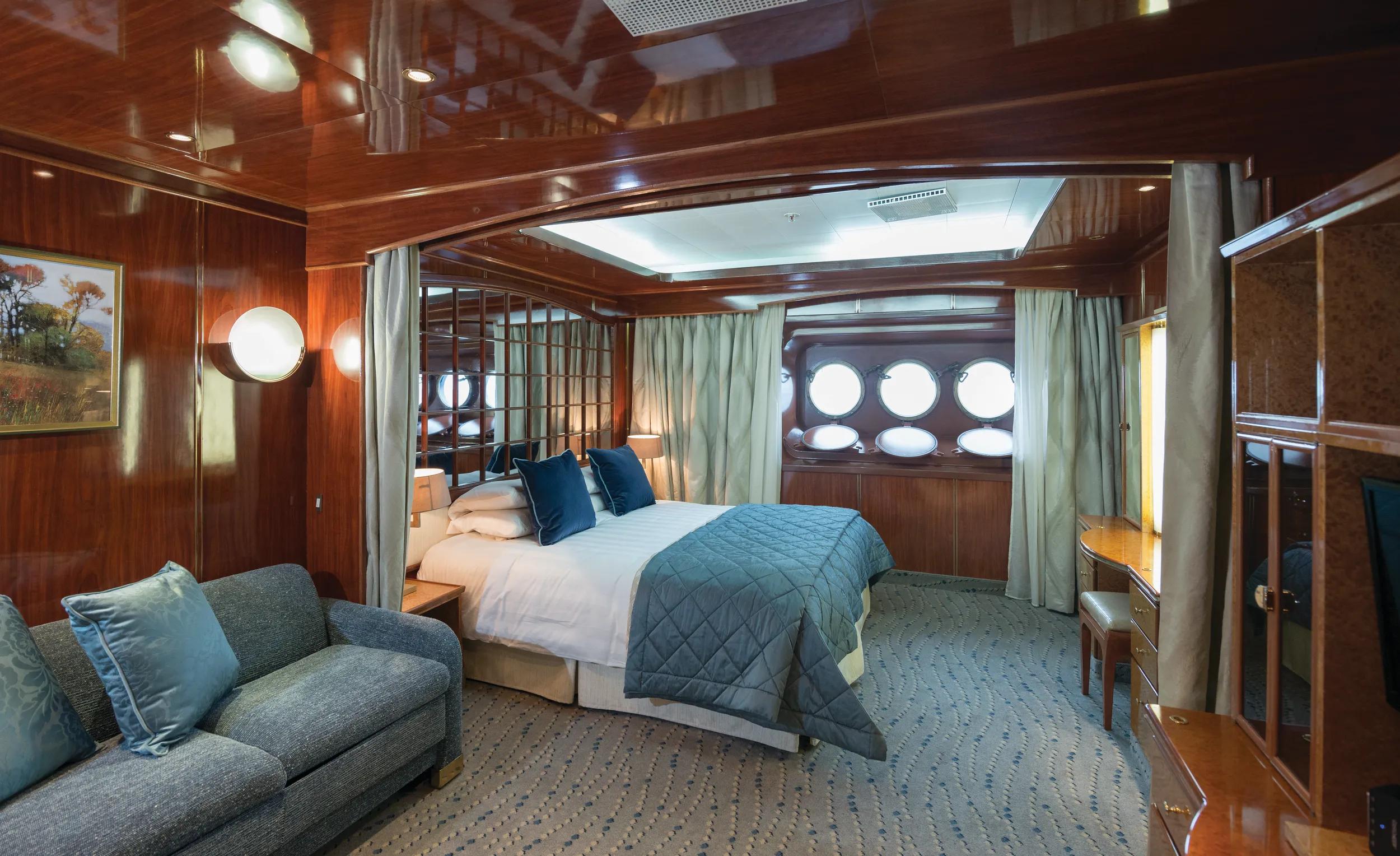 Located on the Amundsen Deck, Standard Suites include queen-size or twin beds, TV, sitting area, ensuite, air-conditioning, wardrobe, and large porthole windows. 21 square metres (226 square feet)
