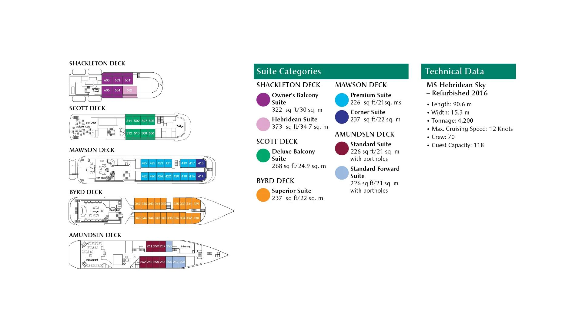 The Shackleton Deck is home to five Owner’s Balcony Suites. Large private balconies, measuring eight square metres, come furnished with a table, chairs and sun lounges. 22 square metres, plus balcony (237 square feet)