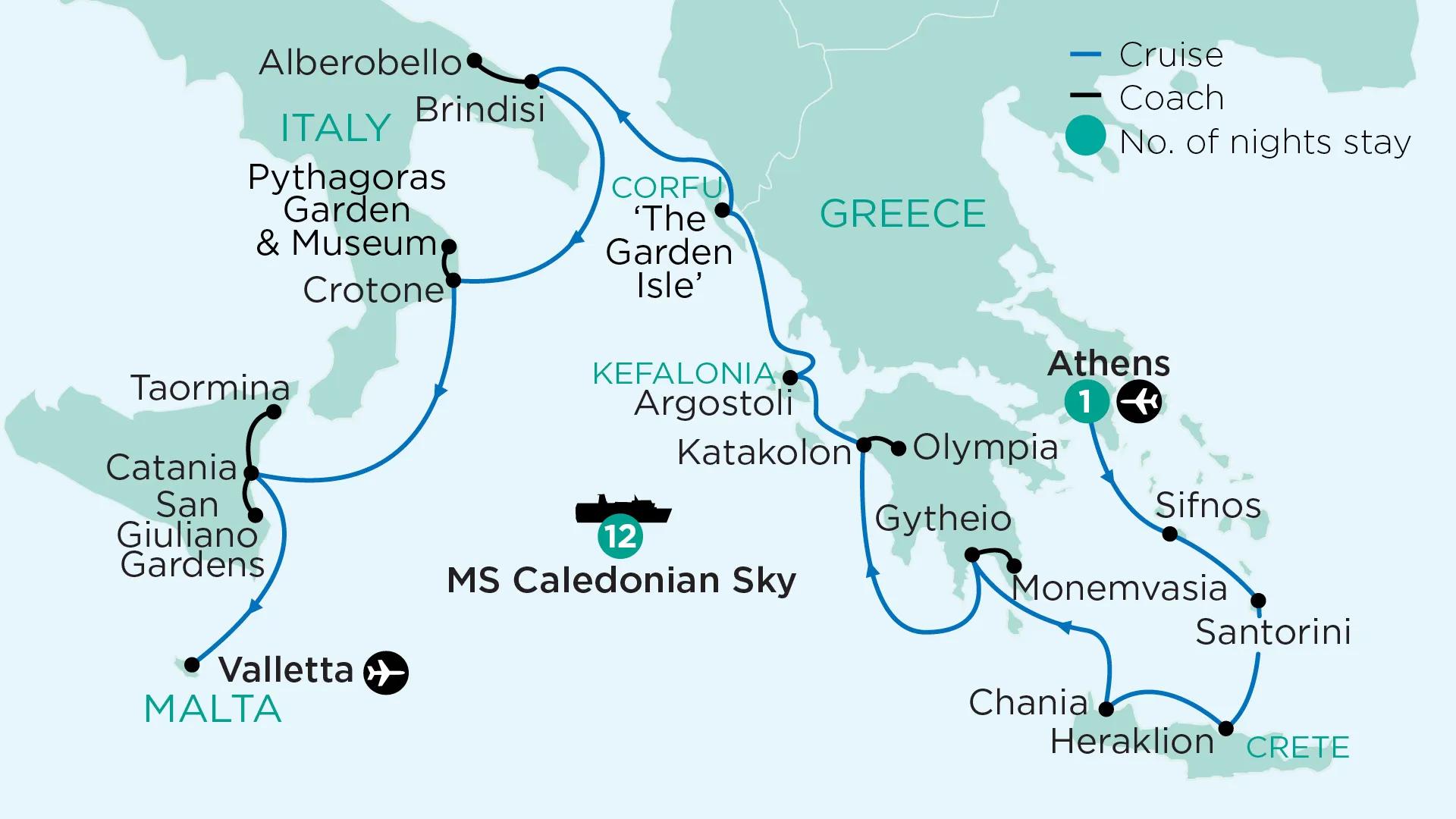 Botanical discoveries of the Greek Islands of Santorini, Sifnos, Crete, Kefalonia and Corfu before cruising to Italy and finishing in Malta