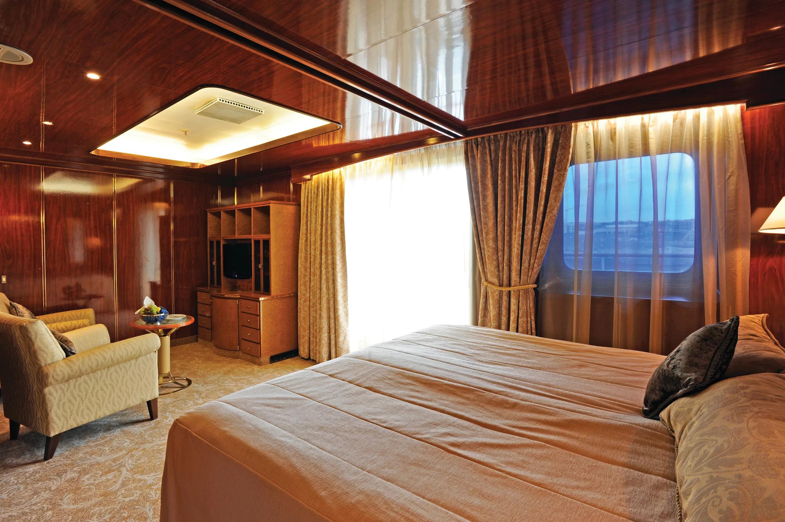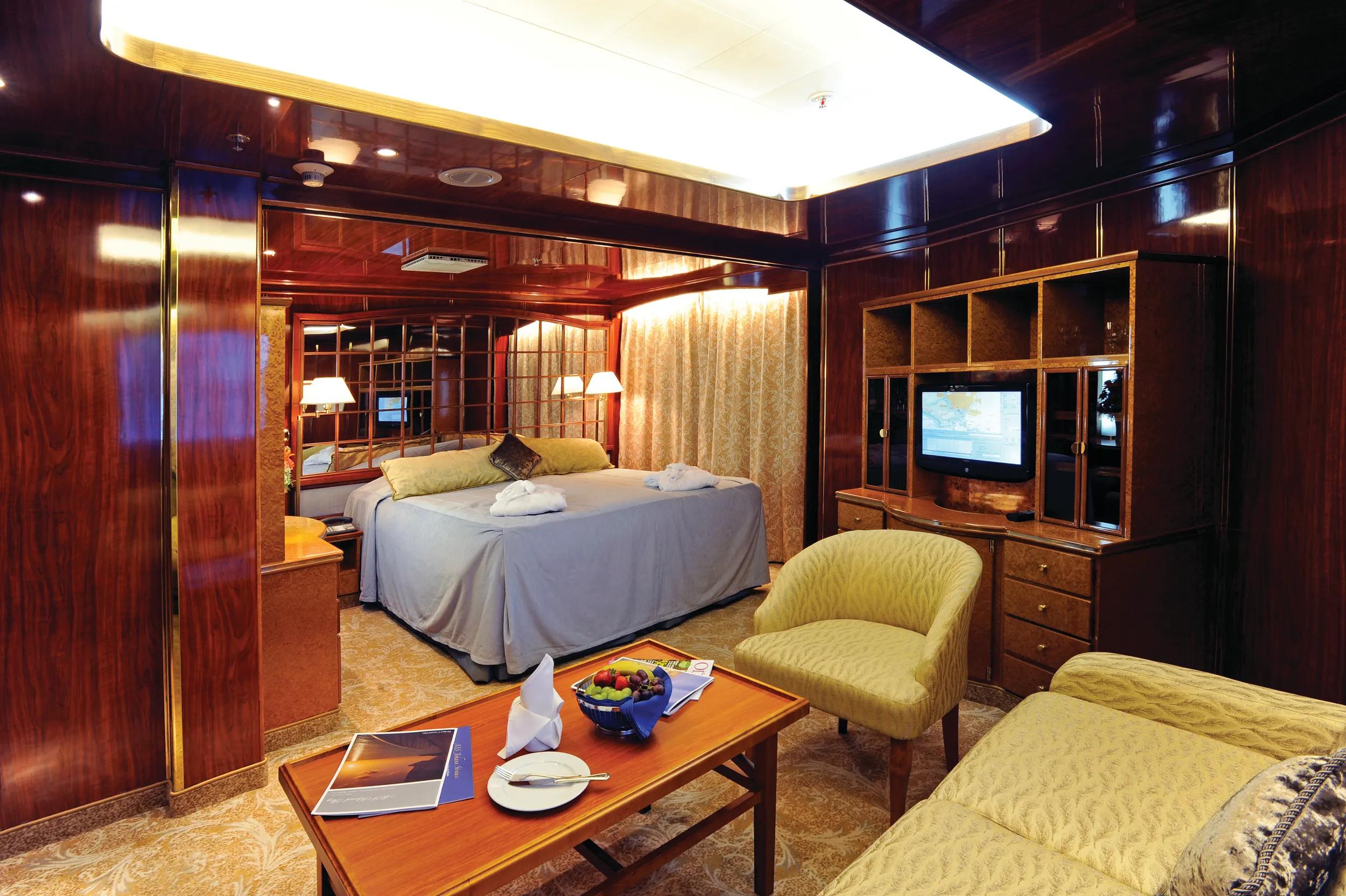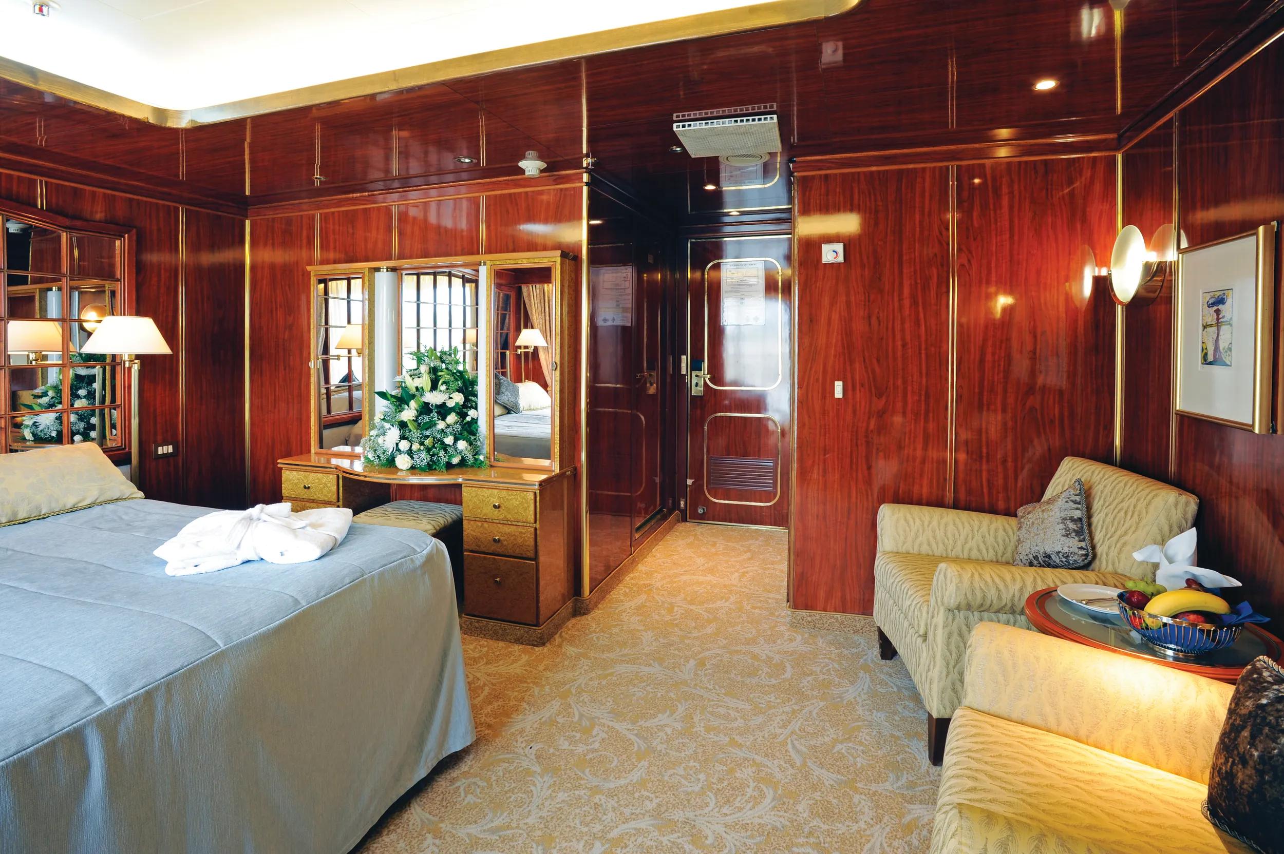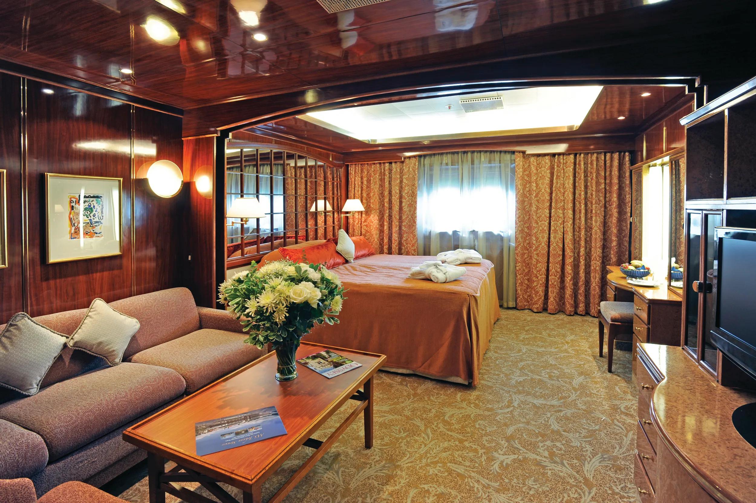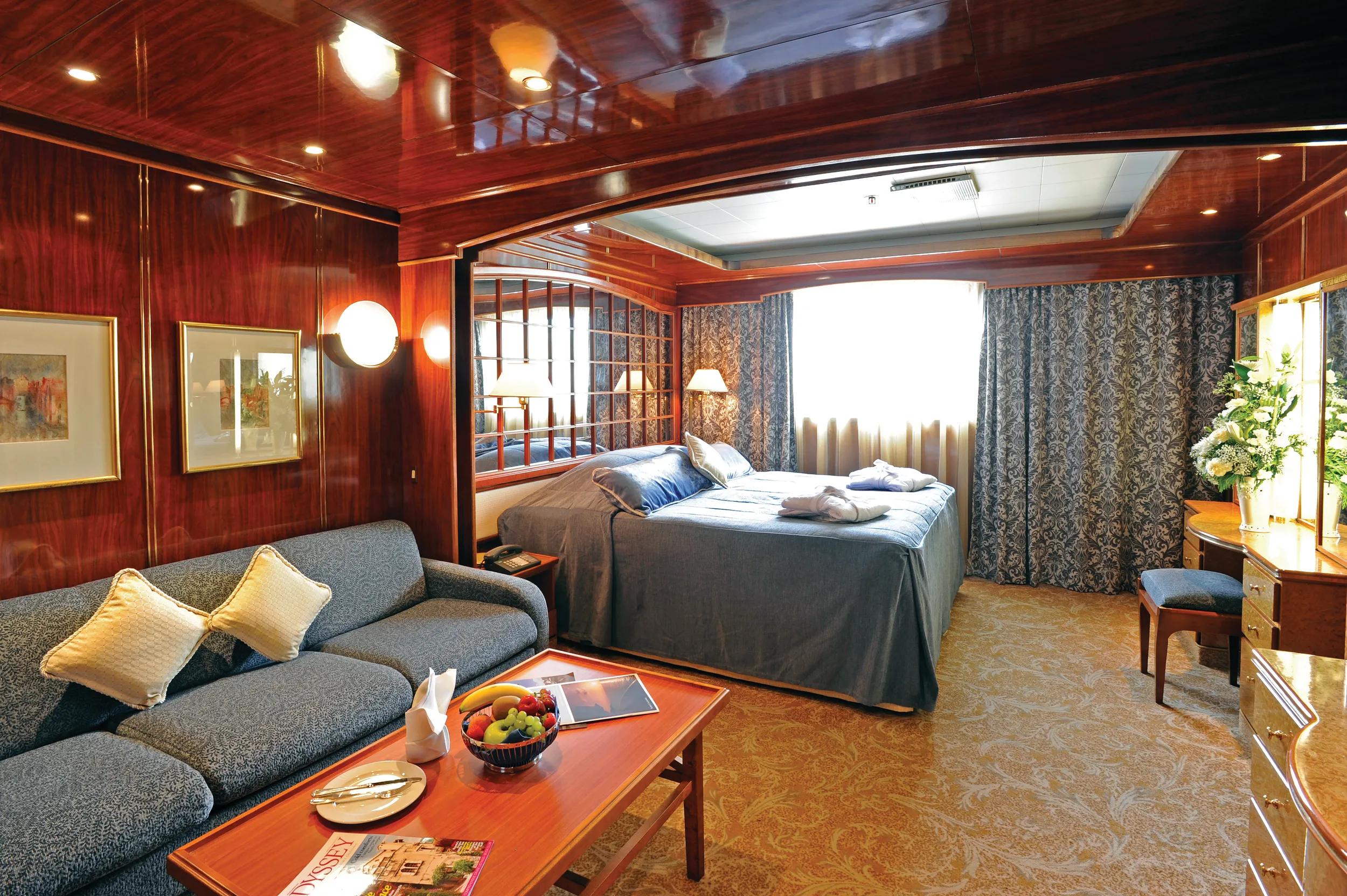 Located on the Magellan Deck, Standard Suites include queen-size or twin beds, TV, sitting area, ensuite, air-conditioning, wardrobe, and large porthole windows. 21 square metres (226 square feet)
